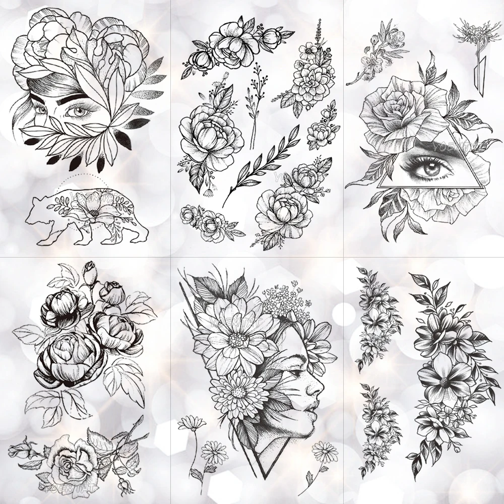 New Sketch Flower Tattoo Stickers Fashion Gothic Black White Waterproof Stickers Geometric Watermark Arm Stickers Wholesale Aliexpress